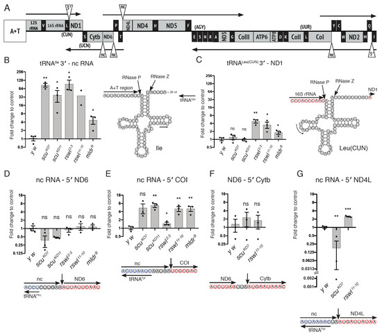mt:tRNA 3′-end and non-canonical processing are differentially affected by mtRNase P. (A) Linear schematic of Drosophila circular mtDNA with triangles indicating the mt:tRNA 3′-end junctions and non-canonical junctions assayed. A+T indicates the adenine and thymine-rich non-coding region that controls replication. (B,C) Graphs represent the log2 fold change in qPCR levels in scu, rswl, and mldr mutant larvae for 3′-end junctions between tRNAIle 3′: non-coding (nc) RNA (B); tRNALeu(CUN) 3′: ND1 (C); ncRNA: 5′ ND6 (D); ncRNA: 5′ COI (E); ND6: 5′ Cytb (F); ncRNA: 5′ ND4L (G). The corresponding predicted cloverleaf structure of mt:tRNA (B,C) or nucleotide context of the 5′-end cleavage site (D–G). The internal mt:tRNA forward primer is indicated with an arrow (B,C). Red circled nucleotides represent 5′ -> 3′ mtRNA, and blue represent the mt:tRNA encoded on the opposite strand. Bars on the graphs represent averaged 2^ddCt, and the y-axis is log2. Further explanation can be found in the materials and methods. The statistical significance was calculated relative to control (y w). Error bars: S.E.M. calculated using GraphPad PRISM using an unpaired t-test, one-tailed. * p < 0.05; ** p < 0.01; *** p < 0.001; ns: not significant.