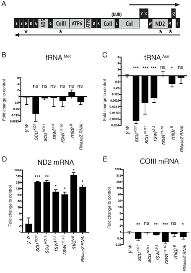 Steady state levels of mt:tRNAs and mt:mRNAs in mtRNase P mutants. (A) Graph of the analyzed mtRNA species (asterisks) located on the same polycistronic transcript. The graphs represent the log2 fold change in the steady-state amounts of mt:tRNAMet (B), mt:tRNAAsn (C), ND2 mRNA (D), and COIII mRNA (E) in scu, rswl, mldr, and RNaseZ RNAi mutants. Bars on the graphs represent averaged 2^ddCt, and the y-axis is log2. Further explanation can be found in the materials and methods. Error bars: S.E.M. calculated in GraphPad PRISM. p-values were calculated using GraphPad PRISM using an unpaired t-test, two-tailed, and compared each mutant to the y w control. * p < 0.05; ** p < 0.01; *** p < 0.001; ns: not significant.