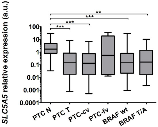 The expression of SLC5A5 was 12.27-fold (p < 0.0001) reduced in PTC (PTC-T, n = 49) compared with normal adjacent tissue (PTC-N, n = 49). The reduction was more profound in the classic variant of PTC (PTC-cv, n = 44, 13.16-fold, p < 0.0001) compared with the follicular variant (PTC-fv, n = 5, 3.11-fold, non-significant). The reduction was observed both in the BRAF wild-type group (BRAF wt, n = 23, 12.27-fold, p = 0.0009) and BRAF mutated group (BRAF T/A, n = 18, 10.65-fold, p = 0.007; please note that expression in tumors was compared with expression in matched controls only). The graph shows the expression of SLC5A5 in thyroid tissue samples normalized against HPRT. Data are expressed as median, interquartile range and 5–95 percentile. Statistical analysis was performed with a Mann–Whitney U test (** p < 0.01, *** p < 0.001). Logarithmic scale was used.