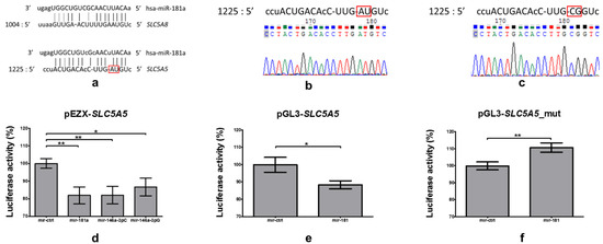 (a) In silico analysis revealed similarity between region of 3′UTR of SLC5A8, which binds with miR-181a-5p (upper part), and region of putative binding of miR-181a-5p in 3′UTR of SLC5A5 (lower part; adapted from microrna.org). (b) A 118bp fragment of 3′UTR of SLC5A5, containing a putative binding site for miR-181a-5p, was subcloned into pGL3-MCS_down_luc plasmid. (c) Two nucleotides (1241–1242) were mutated in putative binding site. (d) Co-transfection of HeLa cells with pEZX-SLC5A5 and plasmids expressing mir-181a, mir-146a-3pC or mir-146a-3pG resulted in a reduction in luciferase activity by 18 (p = 0.005), 18 (p = 0.006) and 13% (p = 0.033), respectively, in comparison with mir-ctrl. (e) Co-transfection of HeLa cells with pGL3-SLC5A5, containing a 118bp fragment of 3′UTR of SLC5A5 with putative miR-181a-5p binding site, and plasmids expressing mir-181a, led to a 12% (p = 0.032) decrease in luciferase activity. (f) Co-transfection of HeLa cells with pGL3-SLC5A5_mut, containing a 118bp fragment of 3′UTR of SLC5A5 with mutations in putative miR-181a-5p binding site, and plasmids expressing mir-181a, did not lead to a reduction in luciferase activity—an 11% (p = 0.0085) increase was observed. Luciferase activity is shown as a percentage relative to the control. The results are normalized by Renilla luciferase and derived from three independent experiments, each performed in triplicates. The graph shows the mean, along with deviations from mean (SEM). Statistical analysis was performed using an unpaired t-test (* p < 0.05, ** p < 0.01).