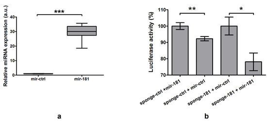Functionality of the mir-expressing plasmid was confirmed in HeLa cells using TaqMan kits. Transfection with mir-181-expressing plasmid led to a 29-fold increase in its expression (p < 0.0001, Figure 5a). Functionality of sponge-expressing plasmids was verified by co-transfecting HeLa cells with sponge- and microRNA-expressing plasmid with appropriate controls. Co-transfection with an appropriate microRNA-expressing plasmid (i.e., expected to bind to the expressed particle) led to reduction in luciferase activity when compared with control transfections—by 8% in the case of control plasmids (p = 0.004), and by 22% for sponge-181 and mir-181 co-transfection (p = 0.012; Figure 5b).