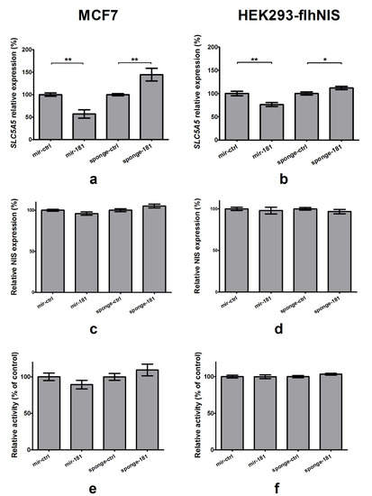 To analyze the effect of miR-181a on endogenous SLC5A5 expression, appropriate mir- or sponge-expressing plasmids were used. MCF-7 cells (ATCC® HTB-22TM) were seeded in medium containing 45% DMEM, 45% F-12 and 10% FBS with addition of 1 µM of all-trans-retinoic acid and dexamethasone (compounds inducing NIS expression [54,55]) onto 12-well plates using 2 × 105 cells per well. HEK293-flhNIS, stably transfected with full-length (i.e., including 5′ and 3′UTR sequences [56]) cells were seeded in DMEM medium onto 12-well plates using 2 × 105 cells per well. After 24 h, cells were transfected with 500 ng of miRNA-expressing plasmid or 100 ng of sponge-expressing plasmid. Cells were incubated for 48 h, and subsequently RNA was extracted for gene expression quantification.