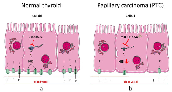 Graphical summary of the study. MicroRNA miR-181a-5p regulates NIS, (a) leading to fine-tuning of NIS in normal thyroid tissue, and (b) contributing to severe NIS downregulation in the context of PTC. Figure contains elements available at Servier Medical Art repository, licensed under a Creative Commons Attribution 3.0 Unported License. http://smart.servier.com/ accessed 28 March 2021.