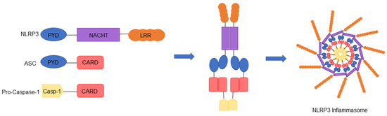 Assembly of the NLRP3 inflammasome. When activated, the adaptor protein (ASC) binds to NLRP3 via its pyrin (PYD) domain and creates a link to pro-caspase-1 via its CARD domain. The NLRP3 inflammasome is formed of NLRP3–ASC–pro-caspase-1 complexes interacting together to form a ring-like structure.