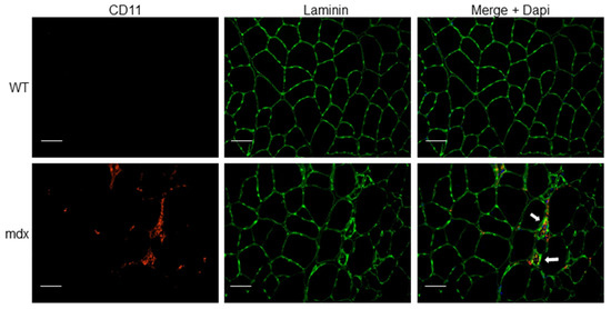Immune cell infiltration in dystrophic muscle tissue. Tibialis anterior (TA) muscle cryosections from wild-type (WT) and mdx mice were immunostained with anti-CD11b (myeloid cell marker) and anti-laminin (muscle fiber membrane stain) antibodies. Nuclei were counterstained with 4′,6′-diamidino-2-phenylindole (DAPI, blue). Arrows indicate myeloid cell infiltrate (red) associated with focal invasion of muscle fibers (green). Scale bars, 50 μm.