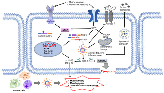 Neuromuscular disorders comprise of a wide range of diseases that are often classified according to the affected regions of the neuromuscular system. For instance, myopathies are diseases in which the muscle is primarily affected (e.g., muscular dystrophies and congenital myopathies), and neurogenic atrophies are diseases in which the motor neurons are affected (e.g., spinal muscular atrophy and amyotrophic lateral sclerosis). Neuromuscular disorders vary in their etiology, age of onset and disease progression; however, all neuromuscular diseases elicit progressive muscle weakness [1]. Skeletal muscle is a secretory organ that releases cytokines (also called myokines) which act as signaling messengers between the muscle and other organs in the endocrine system; thus, it plays an important role both in physiological and pathological processes [2]. Healthy muscles are subjected to consistent mechanical injury, followed by muscle degeneration and activation of acute inflammatory responses. In fact, at the early stage of muscle regeneration, following muscle damage, infiltrating immune cells (i.e., mast cells and neutrophils) clear the damaged myofibers and secrete cytokines to recruit macrophages, to regulate the inflammatory response. This cascade of events stimulates satellite cell activation, proliferation and differentiation to myotubes, resulting in mature muscle fibers [3]. The initial inflammatory response is thought to play an important role in the timely repair of the injured muscle; however, dysregulation of inflammatory signaling is harmful to the muscle and has emerged as a crucial link in the onset of muscle wasting. The activation of the transcription factor nuclear factor-kappa B (NF-κB) has been found to be a critical factor involved in the secretion of proinflammatory cytokines such as interleukin (IL)-6 and tumor necrosis factor-α (TNF-α). These cytokines are known to induce muscle wasting by stimulating proteolysis, thereby tipping the fulcrum towards protein degradation, leading in turn to impairment of muscle regeneration [4]. Interestingly, therapies that inhibit IL-6 or TNF-α and aim to reduce inflammation in patients with cachexia (weight loss and muscle wasting that occurs in chronic diseases) showed limited benefits in clinical trials [5,6,7]. This suggests that other inflammatory players may be involved in muscle wasting. Thus, recently the focus has been switched to understanding the role of the nucleotide-binding oligomerization domain (NOD)-like receptors (NLRs) with pyrin domain 3 (NLRP3) inflammasome in muscles and their connection to muscle degeneration and disease.