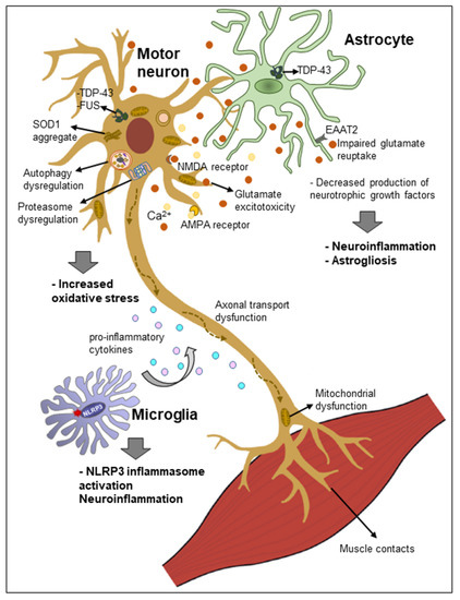 Proposed mechanisms of the pathogenesis of amyotrophic lateral sclerosis (ALS). The mechanisms underlying neurodegeneration in ALS are multifactorial and mediated through a complex interplay of molecular and genetic pathways. Specific pathways involved are increased generation of reactive oxygen species, glutamate excitotoxicity, mitochondrial dysfunction, axonal transport dysfunction and accumulation of cytoplasmic protein aggregates consisting of SOD1, TDP-43 and FUS. Activation of astrocytes and microglia results in secretion of proinflammatory cytokines, leading to neuroinflammation and motor neuron degeneration.