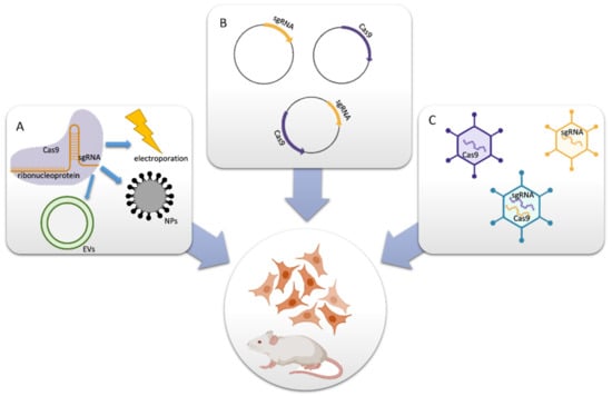 Methods for the delivery of CRISPR/Cas9 components. (A) Cas9 protein and sgRNA form a ribonucleoprotein (RNP) complex, which is packaged into extracellular vesicles (EVs), nanoparticles, or electroporated directly into cells or model organisms. (B) Plasmids expressing Cas9 and/or sgRNA are transfected into cells. (C) Viral vectors encoding Cas9 and/or sgRNA deliver these components in vitro or in vivo. This figure was created using BioRender.com (accessed on April 2021).
