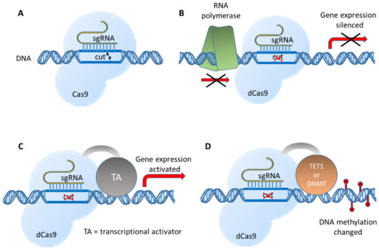 Modifications of Cas9 endonuclease may alter the functioning of the CRISPR/Cas9 system (Figure 2). “Dead” Cas9 (dCas9) for which endonuclease activity is non-functional due to D10A and H840A mutations cannot induce double-strand DNA breaks, but it is still capable of DNA binding. Targeting dCas9 to transcription start sites physically blocks RNA polymerase movement and hinders transcription, thus silencing gene expression through CRISPR interference (CRISPRi) [31].