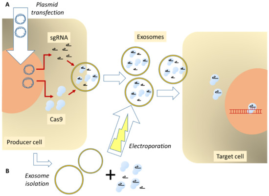 General routes for loading CRISPR/Cas components into EVs. (A) By capitalizing on the cellular packaging routines, producer cells can be transfected with plasmids encoding the Cas9 protein and the sgRNA. (B) After the isolation and purification of EVs, they are loaded in vitro with Cas9 protein and sgRNAs, e.g., by electroporation.