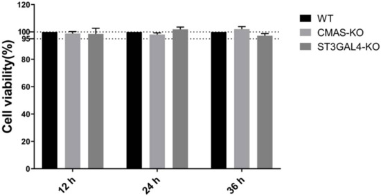 Knockout of CMAS or ST3GAL4 has no effect on cell viability. CMAS-KO and ST3GAL4-KO NPTr cells were generated through the CRISPR/Cas9 system; NPTR-Cas9 cells were used as wild-type control. WT NPTr cells and KO NPTr cells were seeded in 96-well plates and the cell viability was measured at 12, 24 and 36 h.