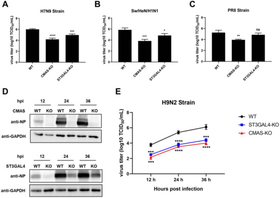 Effects of KO cell lines on the proliferation of influenza viruses of different species. CMAS-KO and ST3GAL4-KO NPTr cells were generated through the CRISPR/Cas9 system; NPTR-Cas9 cells were used as wild-type control. (A–C) Effects of KO cell lines on the proliferation of influenza viruses of different species at 36 hpi. WT NPTr cells and KO NPTr cells were infected with (A) H7N9 virus, (B) Sw/HeN/H1N1 virus or (C) PR8 virus (MOI = 0.01). Cell supernatants were collected at 36 hpi, and virus titers were determined by TCID50 assay on MDCK cells. (Data from three independent experiments, mean ± SD; * p < 0.05; ** p < 0.01; *** p < 0.001; one-way ANOVA). (D,E) Effects of KO cell lines on the proliferation of H9N2 influenza viruses. WT NPTr cells and KO NPTr cells were infected with the H9N2 virus (MOI = 0.01). Cell supernatants and lysates were collected at 12, 24, and 36 hpi. (D) Viral protein expressions were detected by Western blotting or (E) virus titers were determined by TCID50 assay on MDCK cells. (Data from three independent experiments, mean ± SD; * p < 0.05; ** p < 0.01; *** p < 0.001; **** p < 0.0001; ns represented no significance; one-way ANOVA).