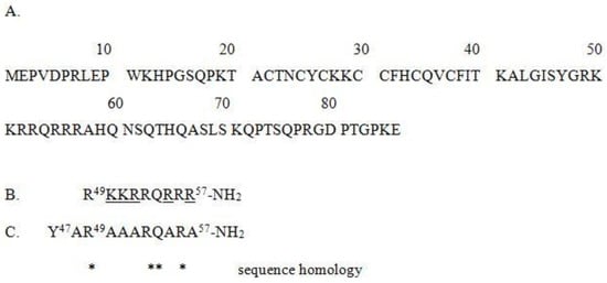 (A) Amino acid sequences of the “canonical” variant of HIV-1 Tat (P04608-1 identifier of the UniProt database), (B) Tat(49–57)-NH2 with underlined Ala-substituted residues, and (C) PTD4. Asterisks (*) indicate positions of sequence homology (R, R, Q, R).