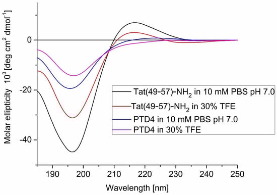 CD spectra of Tat(49–57)-NH2 and PTD4 peptides in 10 mM PBS, pH 7.0 and 30% (v/v) TFE.