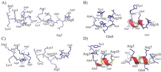 In general, arginine-rich peptides such as Tat(49–57) cannot adopt a helical structure [44]. In aqueous solutions, the polyarginine peptides form unstructured [45] or polyproline type II helical conformations [46,47,48]. Most likely, this phenomenon results from a strong repulsive interaction between the quinidine groups of the arginine residues. As already demonstrated, modeling the Tat’s ARM structure in order to obtain the most stable helical conformation has led to the design of the PTD4 peptide (see Figure 1), in which the replacement of particular arginine residues by alanine residues resulted in a Tat(49–57)-NH2 analogue with enhanced membrane transduction potential [45].