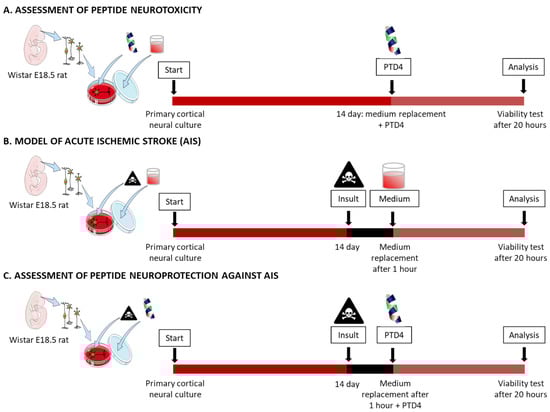 Experimental designs: peptide neurotoxicity (A), in vitro model of AIS (B), and peptide neuroprotection against AIS (C).