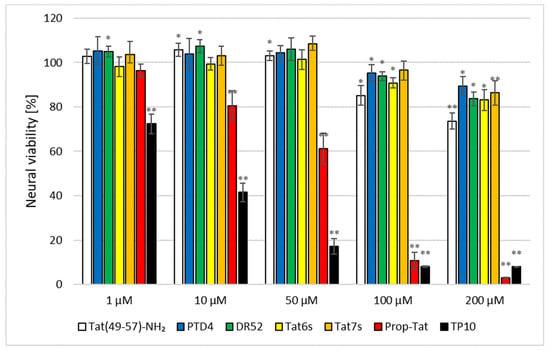 Being a CPP/RRP group member, Tat(49–57)-NH2 expresses ambiguous activity in terms of its influence on neuronal metabolism and signal trafficking within the brain [23]. Hence, pharmacological application of Tat(49–57)-NH2, either as a drug delivery system or a stand-alone neuroprotective agent, would require strict control in both dose-dependent and spatio-temporal manners. Despite the well-documented inherent neuroprotection of RRPs, special attention must be paid to their neurotoxic activities. What is more, C-terminal amidation may increase the neuroprotective effect of the peptide, whereas, conversely, N-terminal acetylation generally decreases it, as was shown for Arg9 peptide [55]. The neurotoxic influence of these post-translational modifications (PTMs) was proven to be dose-dependent and, basically, to enhance peptide stability against enzymatic proteolysis in physiological conditions [56]. Similarly, an ameliorating effect was observed upon the position-specific D-stereoisomerization of CPPs [57]. Comprehensive studies have demonstrated that the D-amino acid-bearing CPPs display higher protease resistance [58] and undergo facilitated cell type-dependent internalization [59]. The effectiveness of the cell entry has been reported to depend upon the number of D-arginine residues in CPPs [60]. Finally, alkylation of CPPs has also been demonstrated to enhance their performance [44]. Such modification of CPPs may change its translocation through the cell membrane or the specificity of membrane receptor recognition [61,62]. These, in turn, may cause peptide neurotoxicity or neuroprotection. To verify these aspects with regard to Tat RRPs, a series of Tat analogues were synthesized (Table 1), and their neurotoxicity was assessed in primary neural cultures (Figure 4, Figure 5 and Figure 6). Apart from Tat(49–57)-NH2 and PTD4, the following modifications were analyzed: N-acetylation (Tat6), arginine methylation (Tat7), N- propiolylation (Prop-Tat), and D-Arg substitution (DR52). Besides, we analyzed TP10 peptide, a commonly used CPP [9], that does not bear amino-acid sequence homology to Tat(49–57)-NH2. This set of analogues contains typical PTMs that diversify these peptides with regard to the net charge and hydrophobicity, and conceivably, with regard to neuroactivity. Prop-Tat analogue was included in this series to characterize the neurotoxicity of the alkyne-bearing component of click-chemistry reaction.