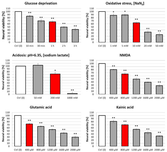 Optimization of an in vitro model of AIS. Red bars indicate conditions causing a 30–40% decrease in neural viability. These conditions were then selected for assessments of the neuroprotective activity of tested peptides. Non-insulted cells were treated as 100% control. Two-way ANOVA statistics: n = 3; * p < 0.05, ** p < 0.001. Each statistical significance asterisk refers to a respective control (white bar) ± SD.