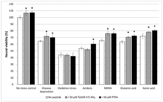 The PTD4 peptide was chosen for this evaluation because of its best performance in neural viability assessment among all Tat tested analogues. The highest non-toxic concentration was selected, however, using a wider range of concentration (1–10 µM) that would give a more conclusive insight into the peptide’s activity [76,77]. The results of neural viability validation are presented in Figure 7. A post-insult 20-h exposure to each peptide revealed their significant survival-stimulating properties against almost all insults except sodium azide-induced oxidative stress. The yields of this ameliorating effect were similar for both peptides, amounting to about 10%. The most pronounced peptide activity was observed as alleviation of energetic deprivation and excitotoxicity. The peptides did not prevent neural death caused by cellular respiration inhibition. In the case of acidosis, only PTD4 displayed pro-viable activity.
