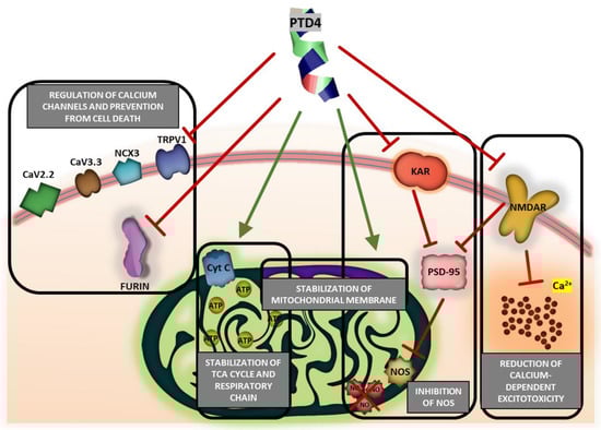 As a BBB shuttle peptide, PTD4 is expected to interact with the cell membrane to enter brain parenchyma [13,14], either in a receptor-independent fashion [110] or via endocytosis or adsorptive-mediated transcytosis [111]. On the contrary to the endocytosis of regular peptides, during which these peptides are encapsulated in the endocytic vesicle, PTD4, as well as other RRPs, enter the cell interior together with an outer membrane receptor or transmembrane channel, which removes them from the outer cell surface [20,112,113]. As known, RRP reduce an excitotoxic calcium influx to the cell interior by their interaction with glutamate agonist receptors [22,112,114]. This interaction induces endocytic internalization of calcium ion channels and transporters, such as an NR2B subunit of NMDA receptor (NMDAR), i.e., a pivotal modulator of excitotoxic neuronal calcium influx and the damaging of signaling in neurons [31]. However, the experimental data on this topic is still ambivalent [115] as Tat peptides were demonstrated either to inhibit NMDAR and lower the toxic intracellular calcium ions level [5,55], or else to trigger glutamate- or NMDA-induced calcium influx [115,116]. From this perspective, PTD4 and Tat(49–57)-NH2, assessed in our in vitro model of AIS, displayed significant neuroprotection against excitotoxicity. Similar ameliorating effects were obtained for hybrid Tat peptides, which were shown to inhibit the activity of the kainite receptor and NMDA-NR2B subunit [108], as well as of NMDAR–PSD-95 complex formation in the intracellular part of NMDAR [31], and which may induce blocking nitric oxide synthase (NOS) activation and nitric oxide (NO) production in mitochondria [31].