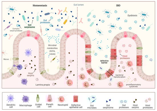 Schematic illustration of gut serpinome involvement in intestinal homeostasis and IBD. During homeostasis, the gut microbiota elicits an immune tolerance phenotype in the host. The activity of luminal serine and cysteine proteases is tightly regulated by their specific serpins of both gut microbial and host origin. A key feature of IBD is the alteration of the composition of the gut microbiota, dysbiosis, characterized by the decrease in microbial diversity with a loss of beneficial symbionts and the expansion of pathobionts. The dysregulation of the proteolytic balance with an increased protease activity over serpins alters the intestinal barrier and exacerbates inflammation. SCFA: short-chain fatty acid.