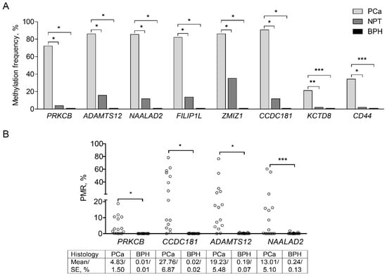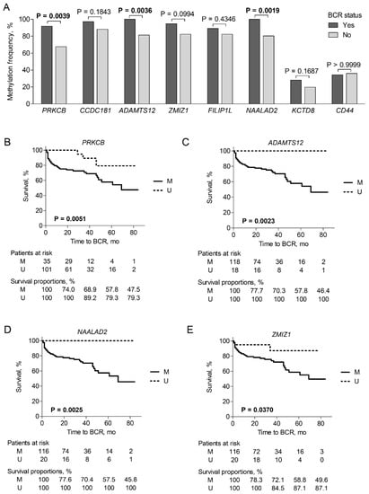 Daniunaite, K.; Bakavicius, A.; Zukauskaite, K.; Rauluseviciute, I.; Lazutka, J.R.; Ulys, A.; Jankevicius, F.; Jarmalaite, S. Promoter Methylation of PRKCB, ADAMTS12, and NAALAD2 Is Specific to Prostate Cancer and Predicts Biochemical Disease Recurrence. Int. J. Mol. Sci. 2021, 22, 6091. https://doi.org/10.3390/ijms22116091