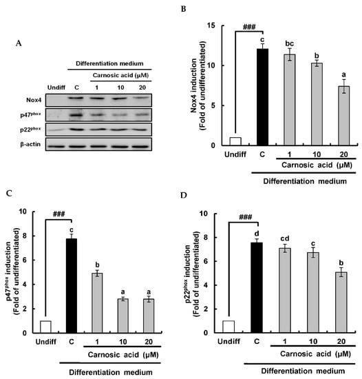 Inhibitory effect of carnosic acid on the translation of Nox4 enzyme components in MDI-induced differentiation of 3T3-L1 pre-adipocytes to adipocytes for two days. (A) Translation of Nox4, p47phox, and p22phox as determined by Western blotting analysis after differentiation for two days. (B) Graphic representation of densitometric analysis of Nox4 blot. (C) Graphic representation of densitometric analysis of p47phox blot. (D) Graphic representation of densitometric analysis of p22phox blot. Data are presented as averages of three independent experiments performed in triplicates and expressed as percentages of the value of control (means ± standard error mean, n = 3). ###: p < 0.001 vs. Undiff. Different corresponding letters indicate significant differences at p < 0.05 using Duncan’s test. (Undiff: undifferentiated, which was not treated with the MDI hormone mixture; C: control, which was treated with the MDI hormone mixture).