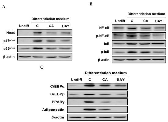 Effects of carnosic acid on the translation of Nox4 enzyme components, phosphorylation of NF-κB and IκBα, and translation of adipogenesis biomarkers in MDI-induced differentiation of 3T3-L1 pre-adipocytes to adipocytes for two days. (A) Translation levels of Nox4, p47phox, and p22phox by Western blotting analysis after differentiation for two days. (B) Translation and phosphorylation levels of NF-κB and IκBα by Western blotting analysis after differentiation for two days. (C) Translation levels of C/EBPα, C/EBPβ, C/EBPγ, and adiponectin by Western blotting analysis after differentiation for two days. Data are presented as representative images of three independent experiments performed in triplicates). (Undiff; undifferentiated, which was not treated with MDI hormone mixture; C: control, which was treated with MDI hormone mixture; BAY: Bay11-7082).