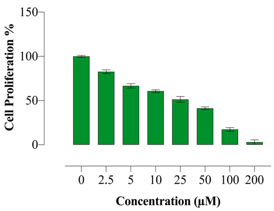 The effects of compound E on the proliferation of HeLa cells were investigated by a commercial proliferation kit BrDU (BioVision, CA, USA) according to the protocols of the manufacturer. Twenty-four hours later, the cells were planted in 96 well plates (104 cell/mL), the medium was replaced, and the substance was administrated at a range from 2.5 to 200 μM for 72 h. Subsequently, the media were added, after which 100 µL 1X of BrdU reactive was added; then, they were placed in an incubator that contained % 5 CO2, 95% fresh air, at 37 °C, for 4 h. The medium was then removed, and 100 μL of fixative/denaturation solution was added and incubated for 30 min. A total of 100 µL 1X of the antibody solution BrdU was added, following 1-h incubation, the solution washed by 300 µL 1X of the washing solution two times. A volume of 100 μL 1X of anti-mouse HRP-linked antibody was added and incubated at room temperature for 1 h. Then, the cells were washed with 300 µL 1X of washing solution. Final incubation was performed by 100 μL of TMB substrate solution for 5 min, after which the stop solution was added; consequently, reading at a wavelength of 450 nm was performed.
