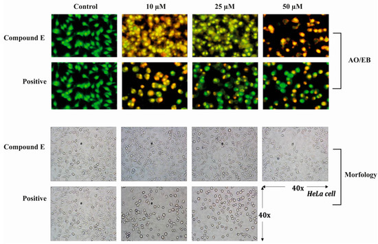 After 24 h incubation of HeLa cells in 12 well-plates at 5 × 104 cell/mL, the compound E at concentrations of 10–50 μM was added on plates, and the cells were incubated at 37 °C for 24 h. The cells were then washed with PBS and incubated in a solution including 100 μL acridine orange (100 µg/mL) and ethidium bromide (100 µg/mL) at room temperature for 5 min. The morphological changes were investigated under fluorescent microscopy (Olympus CKX 51, DP73, USA).