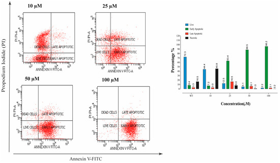 Annexin V/PI staining was performed to determine the ratio of dead cells. It was recorded that a dose of 25 µM compound E indicated a dramatic apoptotic effect, and the early apoptotic cell ratio was increased (Figure 3). Moreover, the degree of this apoptotic effect was positively correlated with the dose of compound E.