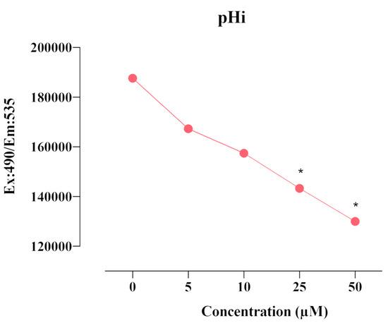 Measurement of pHi level in HeLa cells. A 25 µM dose of compound E inhibited CAIX and decreased intracellular pHi level in a dose-dependent manner. The data are presented as the mean ± SD (n = 3). * p < 0.05 compared with the control.