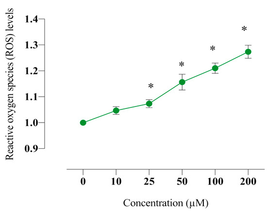 Measurement of intracellular ROS level in HeLa cells. The cells were stained with the ROS red dye, and spectrofluorimetric assay was performed to determine the intracellular ROS. A 25 µM dose of compound E inhibited CAIX and increased intracellular ROS level in a dose-dependent manner. The data are presented as the mean ± SD (n = 3). * p < 0.05 compared with the control.