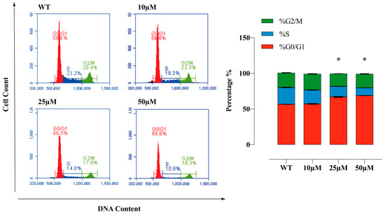 PI staining was used to determine the cell cycle phases. HeLa cells were analysed after incubating with the compound E at doses of 10, 25, and 50 µM for 72 h and confirming the presence of 10.000 cells in flow cytometry. The obtained results are as follows. WT: G0/G1 = 56.6%, S = 23.2%, G2/M = 20.4%; 10 µM: G0/G1 = 56.8%, S = 19.3%, G2/M = 22.3%; 25 µM: G0/G1 = 66.5%, S = 14.6%, G2/M = 17.9% and 50 µM: G0/G1 = 68.8%, S = 10.8%, G2/M = 19.3%. Compound E arrested cell cycle of HeLa cells at the G0/G1 phase (Figure 7).