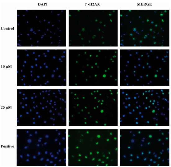 HeLa cells (1 × 104/mL) were seeded in 12-well cell culture plates, and after 24 h incubation, they were treated with the compound E at doses of 10–25–50 µM and incubated for 24 h. The cells were washed with PBS and fixed with 100% methanol at −20 °C overnight, which was followed by PBS washing three times for 10 min. The cells were treated with % 0.2 Triton X-100 on a shaker at room temperature for 5 min. It was washed with PBS, and 1% BSA-containing PBS was added and incubated with primary mouse monoclonal anti-γ-H2AX antibody (Cell Signalling Technology, MA, USA) at 37 °C for 1 h. The cells were washed with PBS three times for 5 min. Secondary goat anti-mouse Alexa-488-conjugated IgG (Invitrogen, CA, USA) was administrated and incubated at 37 °C for 20 min, which was followed by PBS washing three times for 4–5 min. One millilitre of 70% EtOH was added, and at +4 °C it was incubated for 5 min. One millilitre of 100% EtOH was added and, on a shaker, incubated at room temperature for 1–2 min. The nucleus was stained with DAPI. The images were recorded by Olympus Inverted fluorescence microscope (Olympus CKX 51, DP73, USA).