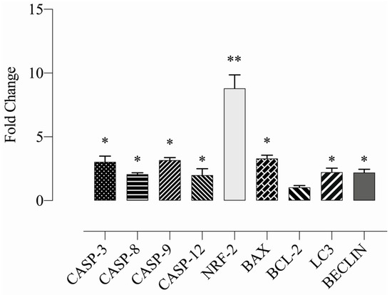 Expression levels of apoptotic genes were evaluated using mRNA samples of HeLa cells treated with compound E at a dose of 25 µM. The Ct values were normalized with the GAPDH gene. The expression changes were analysed by calculating 2^-ΔΔCt (fold change). The expression levels of CASP-3,8,9 and 12 genes increased at least two-fold in the group treated with 25 µM compound E compared to the control group (WT). While the level of pro-apoptotic BAX gene expression significantly increased, the change in BCL-2 gene was not significant. The expression levels of NRF-2, and BECLIN-1 and LC3 genes, mediators of autophagy pathway, increased, suggesting that type I and type II death pathways were triggered in HeLa cells after the compound E administration (* p < 0.05; ** p < 0.01) (Figure 9).