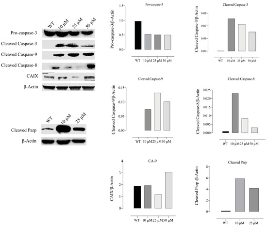 To evaluate the expression of genes involved in the apoptotic pathway triggered by CAIX inhibiton, we investigated the expression of genes regulating the apoptotic pathway (CAS-3,8,9,12, BAX and BCL-2) and found that caspases and BAX significantly increased but BCL-2 did not change (* p < 0.05; ** p < 0.01) (Figure 9), which is consistent with the findings of Western blot. However, the protein level of pro-caspase-3 decreased, and the significant increases in protein levels of cleaved 3, 8, and 9 were recorded. Furthermore, the protein level of cleaved PARP, an indicator of DNA damage, increased (Figure 10).