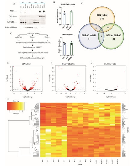 Significant differences in cardiac transcriptome in B6N and B6J are not due to Nnt expression. (A) Western blot of NNT expression in liver cellular fractions. WCL—whole cell lysate; Nuc—nuclear fraction; Cyto—cytoplasmic fraction; Mito—mitochondrial fraction; COXII—cytochrome c oxidase subunit II. Representative image of 3 biological repeats. (B) Quantification of NNT expression in whole cell lysate and mitochondrial fractins. (C) Pipeline of RNA extraction, library preparation and in silico analysis for each tissue. (D) Venn diagram showing overlap of DEGs in each pairwise comparison. (E–G) Volcano plot of gene expression between B6N and B6J (E), B6N and B6JBAC (F) and B6JBAC vs. B6J (G). (H) Heatmap of 51 DEGs common to B6N vs. B6J and B6N vs. B6JBAC analyses. n = 5 mice per group.