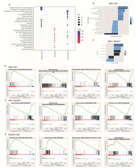 Nnt-dependent expression of pathways associated with respiration in the heart. (A) Over-representation analysis (ORA) dot plot of enriched KEGG pathways in DEGs of each comparison. ER—enrichment ratio; FDR—False Discovery Rate. (B,C) Gene Set Enrichment Analysis (GSEA) of DEGs in the B6N vs. B6J (B) and B6N vs. B6JBAC (C). (D–F) GSEA of whole expression dataset for B6N vs. B6J (D), B6N vs. B6JBAC (E) and B6JBAC vs. B6J (F). Selected gene sets displayed with an FDR < 0.25. A negative normalized enrichment score (NES) indicates a relative downregulation of the pathway in the first group compared to the second, and vice versa. n = 5 mice per group.
