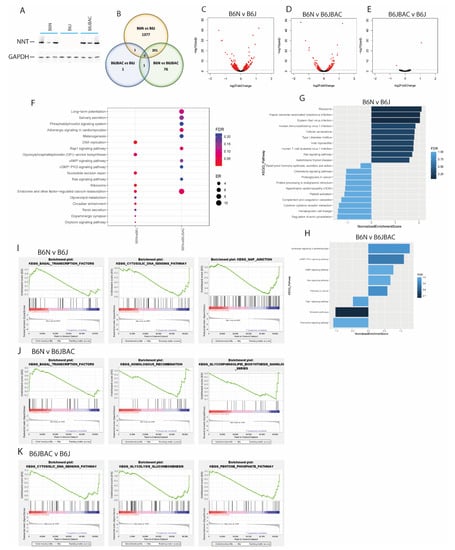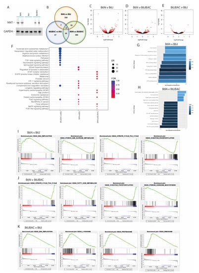 Pathway analysis of testes gene expression. (A) Western blot of NNT expression in testes tissue lysates with GAPDH as a loading control. n = 3 biological repeats. (B) Venn diagram showing overlap of DEGs in each pairwise comparison. (C–E) Volcano plot of gene expression between B6N and B6J (C), B6N and B6JBAC (D) and B6JBAC vs. B6J (E). (F) Over-representation analysis (ORA) dot plot of enriched KEGG pathways in DEGs of each comparison. ER—enrichment ratio; FDR—False Discovery Rate. (G,H) Gene Set Enrichment Analysis (GSEA) of DEGs in the B6N vs. B6J (G) and B6N vs. B6JBAC (H). (I–K) GSEA of whole expression dataset for B6N vs. B6J (I), B6N vs. B6JBAC (J) and B6JBAC vs. B6J (K). Selected gene sets displayed with an FDR < 0.25. A negative normalized enrichment score (NES) indicates a relative downregulation of the pathway in the first group compared to the second, and vice versa. n = 5 mice for B6J and B6JBAC, 4 for B6N.