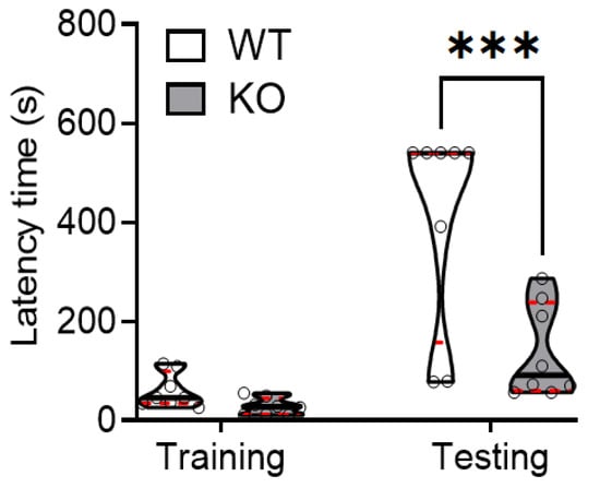 SREBP-1c deficiency significantly impairs learning and memory function in mice. Using the passive avoidance test, WT and SREBP-1c KO mice were trained using mild electrical foot shocks. Both groups were tested 24 h after training. Cross-over latency (s) was assessed to evaluate memory retention. SREBP-1c KO mice showed a significantly lesser increase in the cross-over latency before entering the dark room during testing than WT mice (WT: 406 ± 208.77 s, KO: 138.3 ± 94.40 s, n = 8 per group; Finteraction (1,14) = 10.17, p = 0.0002). The upper and lower dashed red lines signify the upper and lower quartiles, respectively, and the median is represented by a solid black line within a violin plot. *** p < 0.001 vs. WT. WT, wild-type littermate; KO, SREBP-1c KO group.