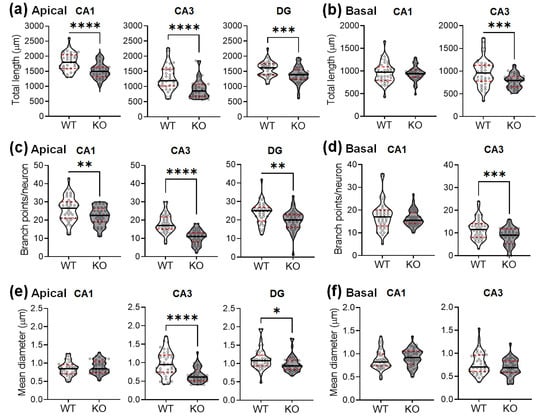 The Golgi-stained neurons were also examined for variations in the dendritic thickness in WT and KO mice (Figure 3e,f). The dendritic diameters were significantly reduced in the apical CA3 (Figure 3e, middle violin plots) and DG subregions (Figure 3e, right violin plots) of KO mice, but not in the other areas (CA1 apical: Figure 3e, left violin plots; CA1 basal: Figure 3f, left violin plots; CA3 basal: Figure 3f, right violin plots).