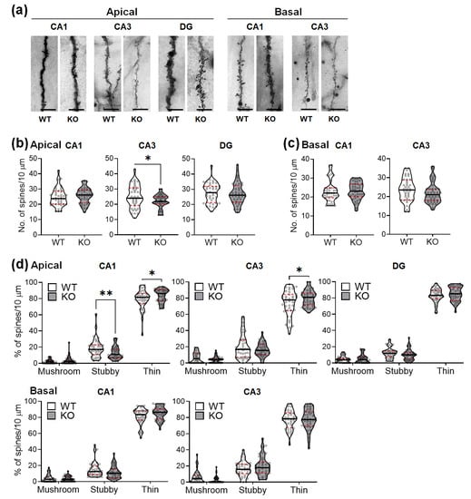 Changes in the proportions of different dendritic spine morphologies were observed in the apical CA1 and apical CA3 subregions. Stubby spines were significantly reduced in the apical CA1 subregion (Figure 4d, upper left violin plots), but not in the other areas. In contrast, the thin spines were significantly increased in the apical CA1 (Figure 4d, upper left violin plots) and apical CA3 subregions (Figure 4d, upper middle violin plots), but not in the other subregions. No significant changes in the proportion of mushroom-shaped spines were observed. Table 4 shows the results of two-way ANOVA tests for the effects of the genotype and spine morphology on the proportion of dendritic spines in each hippocampal subregion of WT and KO mice (n = 40 dendritic segments (10 μm)/group).