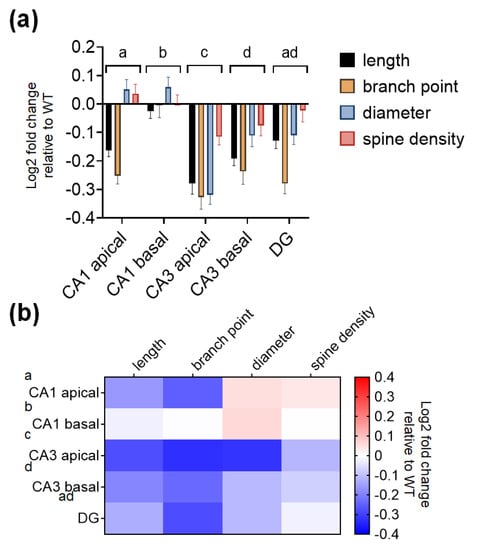 The values of log2 fold changes in the total length, number of branch points, diameter, and spine densities of the dendrites in each KO hippocampal subregion relative to the WT subregion were obtained and statistically analyzed using Prism (GraphPad Software, San Diego, CA, USA).