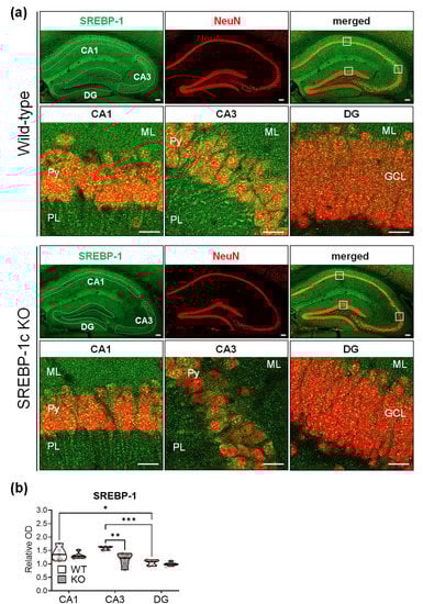 SREBP-1c KO mice show different levels of SREBP-1 protein expressions in each subregion of the hippocampus. Representative immunofluorescence images from each group show expressions of SREBP-1 (green) and NeuN (red)—a neuron-specific marker—in the various hippocampal subregions (CA1, CA3, and DG) (a). KO mice showed relatively lesser levels of SREBP-1 expression in all subregions, especially in the CA3 subregion; SREBP-1 was mainly expressed in the pyramidal and granular cell layers of the CA and DG subregions, respectively. Violin plots show the relative intensities of SREBP-1 expression in the pyramidal cell layers (CA1 and CA3) and granular cell layer (DG) in each of the hippocampal subregions (CA1, CA3, and DG) of WT and KO mice (b). Upper and lower dashed red lines represent the upper and lower quartiles, respectively, and the median is represented by a solid black line within a violin plot. * p < 0.05, ** p < 0.01, *** p < 0.001 vs. WT (n = 5 animals/group). The scale bars represent 100 and 20 µm in the hippocampal and subregion images, respectively. CA, cornu ammonis; DG, dentate gyrus; GCL, granular cell layer; ML, molecular layer; PL, polymorphic cell layer; Py, pyramidal cell layer; SREBP, sterol regulatory element-binding protein; NeuN, neuronal nuclei; WT, wild-type littermate; KO, SREBP-1c KO group.