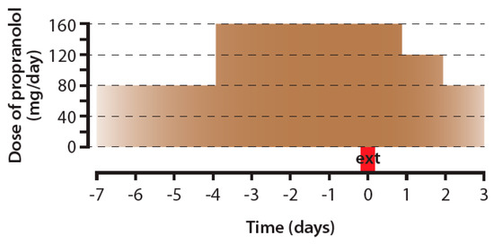 Dosage of propranolol used to prevent perioperative and postoperative metastases in a clinical study by Hiller, et al. [96]. At the beginning (day −7), patients received 40 mg of propranolol twice a day; from day −4, they received 80 mg twice a day, and after the operation, the dose was gradually reduced. ext—day of tumor tissue extirpation.