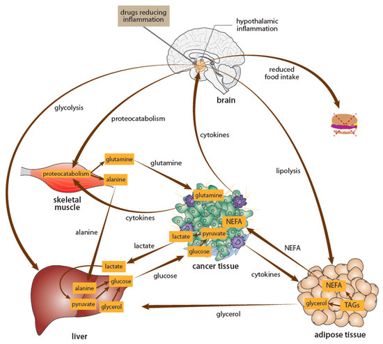 Schematic depiction of the mechanisms involved in the development of cancer cachexia. In addition to peripheral mechanisms, hypothalamic inflammation induced by cytokines and other factors synthesized in the tumor microenvironment and peripheral tissues is involved in the development of cachexia. Hypothalamic inflammation disrupts regulation of food intake and increases energy expenditure. Therefore, drugs such as aspirin or metformin might directly or indirectly reduce hypothalamic inflammation and could be useful in the treatment of cancer anorexia and cachexia. Modified according to Argiles, et al. [149]. NEFA—non-essential fatty acids; TAGs—triacylglycerols.