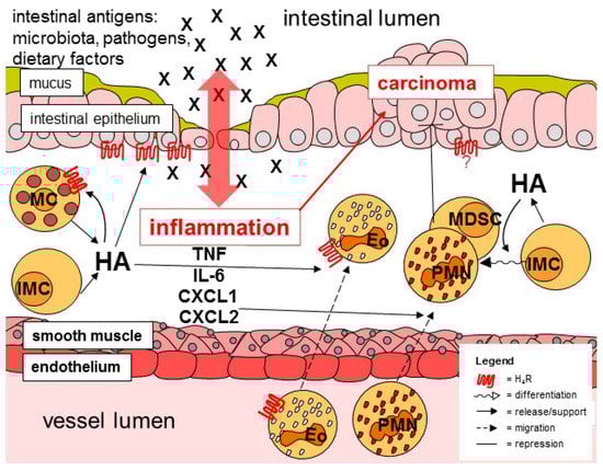 Schematic representation of inflammatory and carcinogenic mechanisms in the colon. MC, mast cell; IMC, immature myeloid cell; HA, histamine; Eo, eosinophil; PMN, neutrophil; MDSC, myeloid-derived suppressor cells.