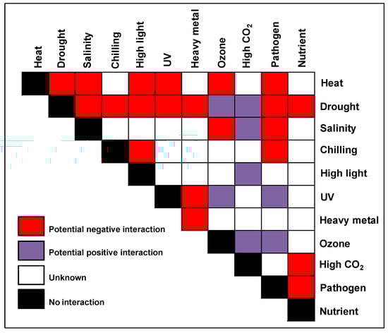 The stress matrix. Different combinations of potential environmental stresses that can affect crops in the field are shown in the form of a matrix. The color of the matrix indicates stress combinations that were studied with a range of crops and their overall effect on plant growth and yield. References for the combined studies are given in the Table 2.