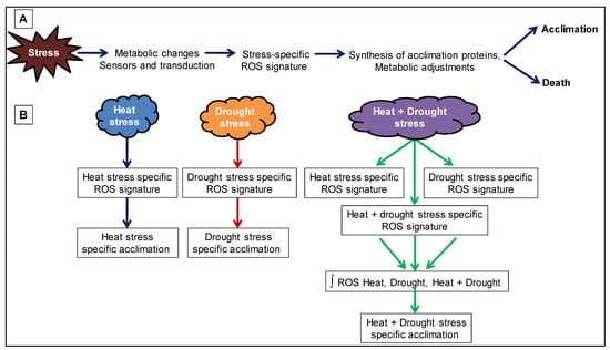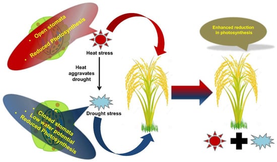 In the coming decades, a significant rise in agricultural productivity will be required to meet the food requirements of ~800 million undernourished people, the number which has been further growing at an alarming pace, along with the shrinking arable land [1,2,3]. In addition, under changing climatic scenarios, this challenge is further exacerbated with predicted aggravation in the frequency and magnitude of extreme and unpredictable weather events, i.e., high temperature, drought, salinity and flooding that adversely affect crop productivity and global ecosystem diversity [3,4,5,6]. Hence, to ensure global nutritional and food security, development of climate-resilient crops is the need of the hour. Most abiotic stresses, occurring either in combination or sequentially, adversely influence the earth crust by modifying the physico-biochemical properties of water, soil, atmosphere, and consequently, plants face hostile conditions [4]. Thus, crop plants continuously face various combinations or sequences of diverse abiotic stresses under field conditions [7]. Such combined or sequential stresses elicit unique acclimation responses that cannot be observed by the application of any of the stress in isolation [7]. Combined or sequential occurrences of abiotic stresses can damage the crops more significantly than their individual occurrences during various developmental stages [8,9]. In response to these abiotic stresses, plants develop innumerable physiological, biochemical, cellular and molecular mechanisms to sense and respond against different abiotic stresses [9,10]. Until now, most of the the plant-environment interaction studies have been focused on crop responses against individual stress, which usually could not be replicated in a similar manner under actual field conditions where a complex interplay of multiple stresses occur, either in combination or sequentially [11].